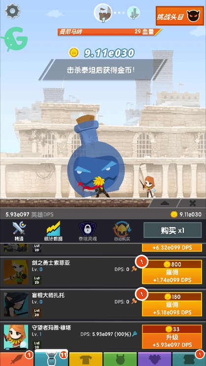 (1)除此之外,进入游戏玩一会就会发现底下的菜单栏从原来的4个变成了现在的6个,除了之前的主角栏、雇用英雄栏、神器栏和商店之外,这次还多了装备和宠物两栏,别小看这两个多出来的,这让游戏的成长系统多了两个也能让游戏变得更耐玩,装备可以改变主角的装扮也可以使自己变得更强大。