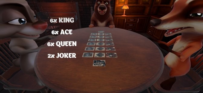 每轮发牌前指定一种牌为本轮目标牌,然后通过俄罗斯赌盘转圈的方式轮流进行,每人每次最少出1张最多出3张,但是牌是背面朝上,场上人要猜测你说的是真是假。