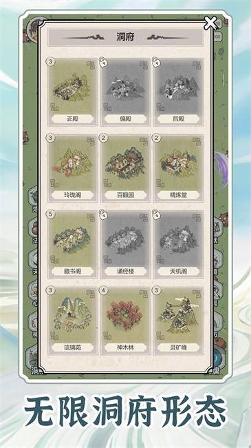2、洞天福地,两仪四象生八卦,洞天福地,五行灵根,天材地宝,应有尽有,有大能者方可居之。