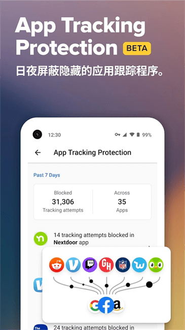 摆脱广告跟踪网络—我们的隐私保护功能可阻断我们发现的所有隐形跟踪器,显示一直跟踪您的主要广告网络,以便让您追踪跟踪方。