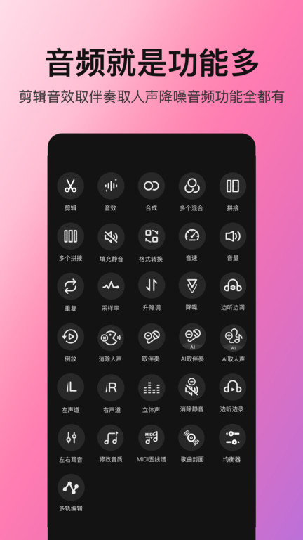 音想音频app是一款非常专业的音频控制便捷软件,用户在这里可以进行各种各样的音频合成、剪切、拼接等类型的使用,让你制作出自己想要的音频效果,更好进行歌曲的制作,快来这里下载吧!