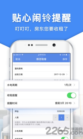 它是出租房屋管理系统,主要功能有房产管理,租客管理,账单管理,水电费计算,收租提醒,发送账单等;界面简洁清晰,操作简单实用。将收租变成一件快乐的事!赶快来试试吧。