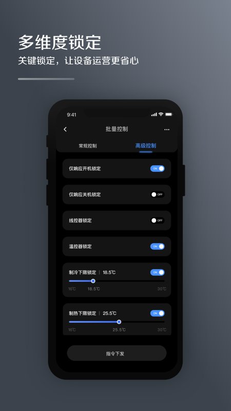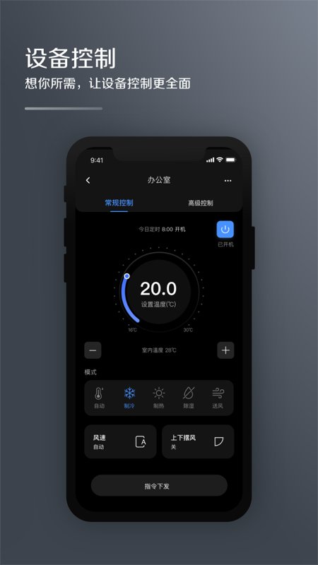 【远程的设备控制】:远程对空调进行单独或批量控制,涵盖启停、温度、模式、风速等多个参数的常规和高级控制;