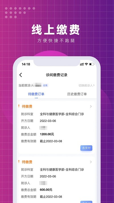 3、患者可通过APP完成预约挂号、线上缴费、检查预约等线上就医服务;