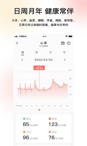 搭配智能手环使用可管理您的日常步数,睡眠,生活中能够提醒来电,短信消息,更能为您提供24小时心率和血压测量,给出相关意见及小贴士,为您的健康护航。为你的身体健康计划出合理的饮食习惯,以及生活习惯,实时查收你的健康数据,合理安排你日常生活。