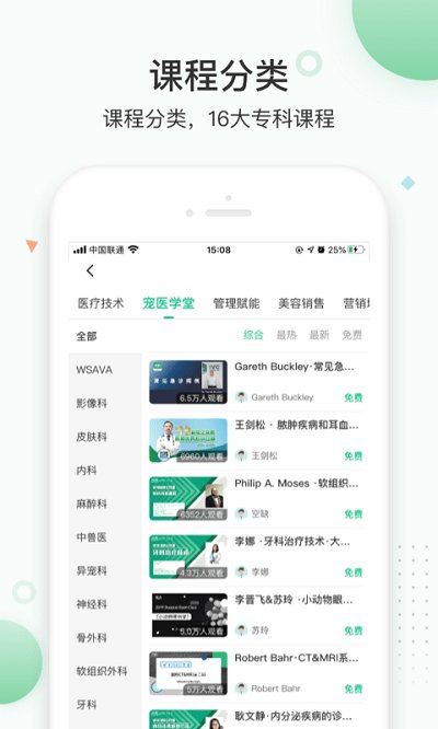 -提供多种科室学习课程:心脏科、眼科、肿瘤科、内科、麻醉科、中兽医、兽医助理、急救