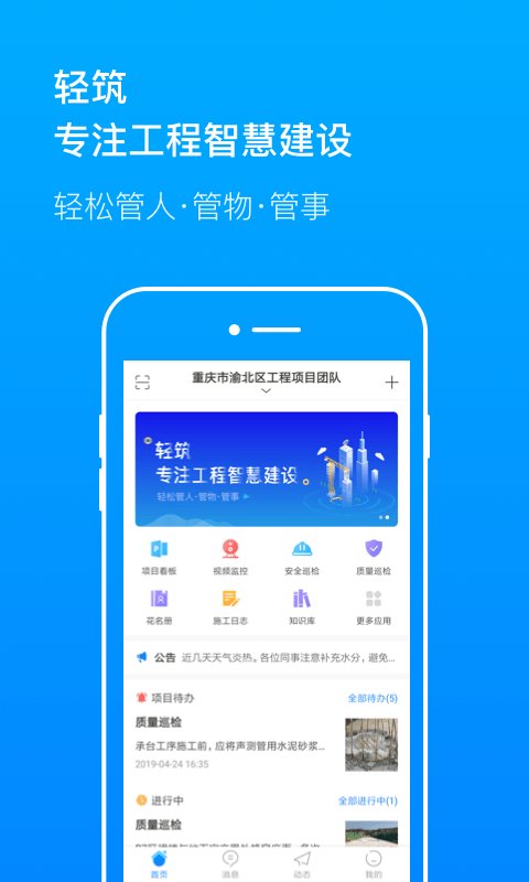 轻筑app是一款专注与建筑行业的办公软件,用户在这里进行海量的工程项目管理,让你在这里进行优质的通讯服务,让你能够快速进行交流,及时获得最新的任务进行处理,快来下载吧!