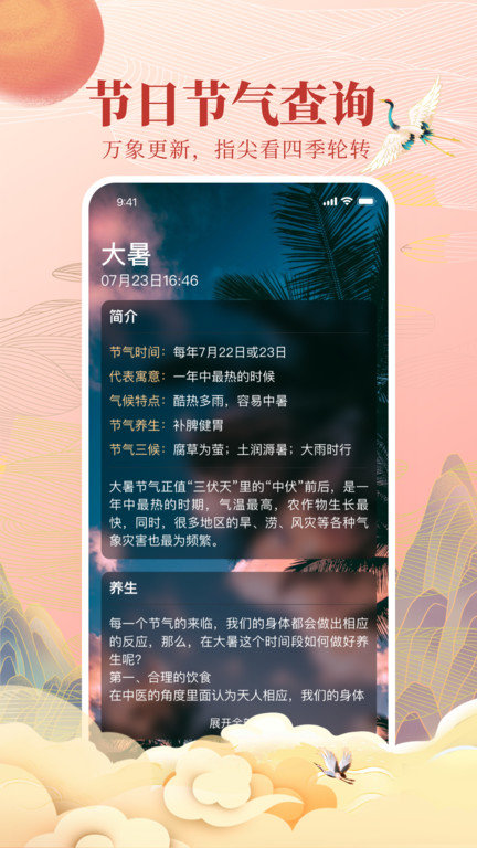3、【日历查询】简洁大方日历视图。新历、农历、黄历、24节气、节假日、每日宜忌、吉日查询不错过任何一个好日子。