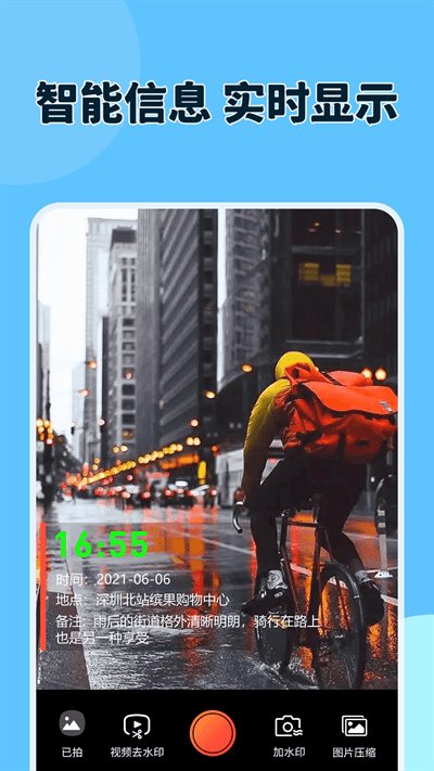 ·选好水印、一键拍照,水印照片自动生成,让你边拍照边打卡,时刻记录你的生活
