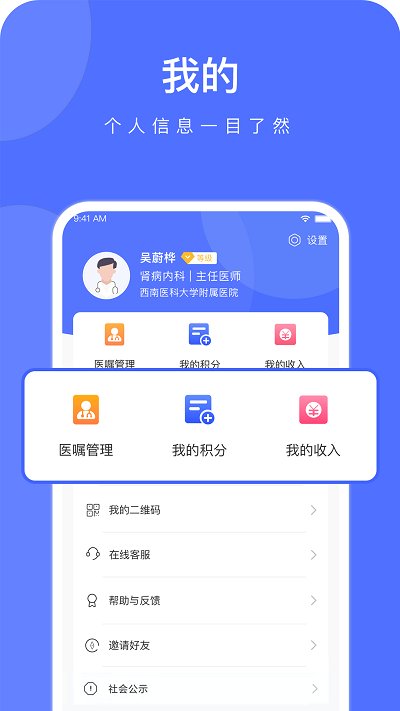 【我的】:是医生自我要管理维护的结果信息及APP中必要的一些辅助功能,如医生个人基本资料、会员订单信息等等,方便医生即时查询使用。