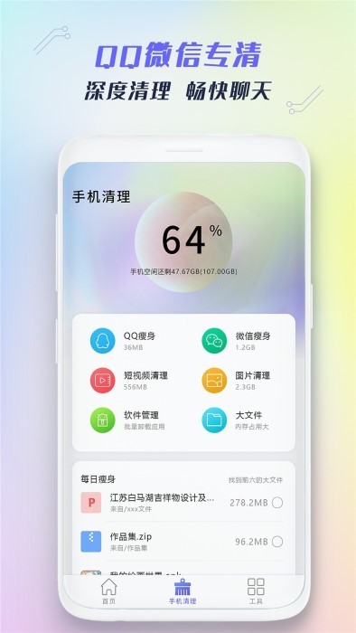 为手机选择qq或者微信瘦身,短视频、图片、大文件专清,深度清理你的手机垃圾,让手机深度还原大内存空间!畅快聊天不是梦!