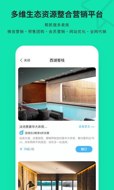 小程序、微客栈依托微信10亿+流量,为民宿自建渠道,0佣金OTA,多种玩法,简单营销。