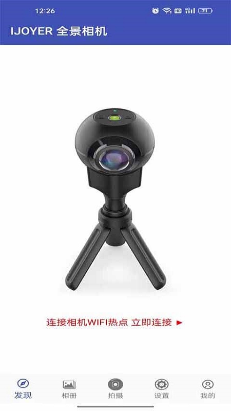 用于连接艾卓悦全景相机Wifi热点操作拍照,录像,菜单设置与其文件下载播放及分享等。