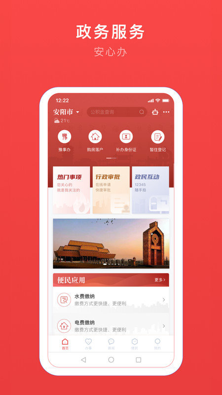 安馨办app官方版是一款政务相关的便民办事服务平台,为安阳市民提供了便捷的相关办事渠道,可以了解本地生活的相关资讯信息,从衣食住行都能提供很多帮助,还有政务手续等办理也无需去办事大厅了,直接在这里就可以在线办理了,为大家节约了很多的时间。