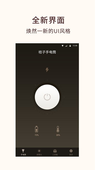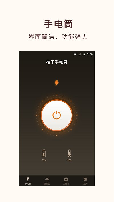 桔子手电筒软件手机版是一款非常实用的手电筒app,界面简洁功能强大,菜单功能方便用户操作,切换更加的方便,还有工具箱,集合众多其他功能,用户可以手电筒的亮度随意调节,需要的用户可以来点击下载。
