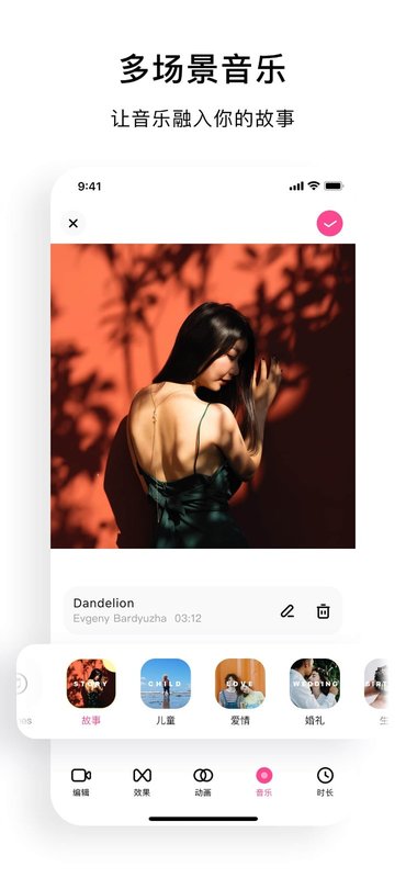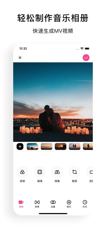 视频MV的每一个片段你都能便捷的编辑,美化,定义;可视化你每个阶段的成长,分享你每一刻的快乐。