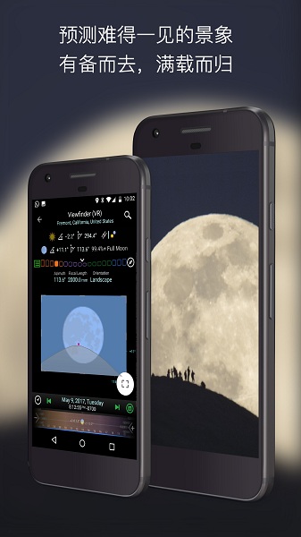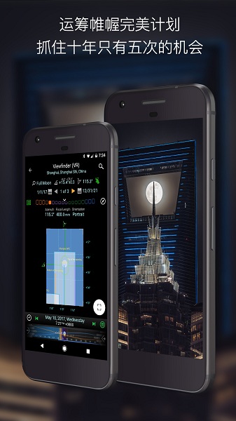 摄影师对相机取景框是非常熟悉的。现在您可以在Planit!里面看到模拟的取景框。这个取景框可以是虚拟现实,增强现实,图片或者街景,然后上面会有星历的覆盖层。