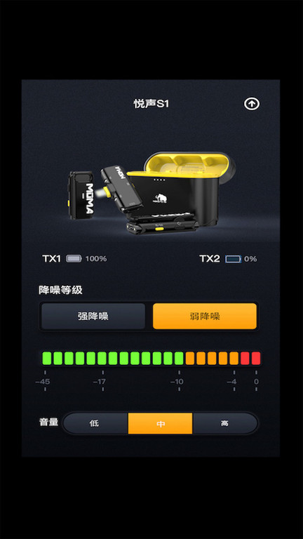 悦声s1无线麦克风配备指尖降噪功能,轻点发射器上的黄色按钮,即可开启降噪功能,收音更清晰,满足复杂收音场景使用需求。