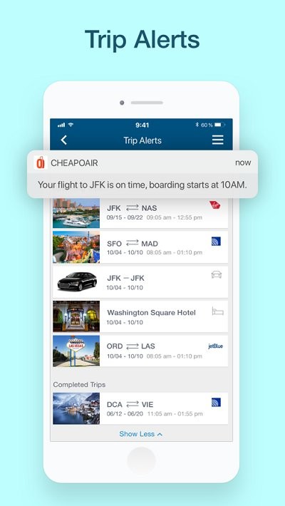 cheapoair是屡获殊荣的旅行应用程序。没有垃圾邮件。无广告。没有弹出窗口。只是您明智地预订的信心,让您知道何时购买廉价航班。只需关注航班,并在价格下降时收到通知!