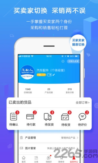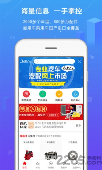 它是服务于汽车汽配厂家、经销商、修理厂、服务站、个人用户等汽车 后市场的专业平台,涵盖国内外2000多个车型、20多万厂商、800多万配件信息,2265用户通过汽配人手机端可以快速查找需要的配件和厂商,清晰的分类、强大的搜索、高品质的产品、实惠的价格、方便的沟通,是汽车后市场用户必备的采销工具!