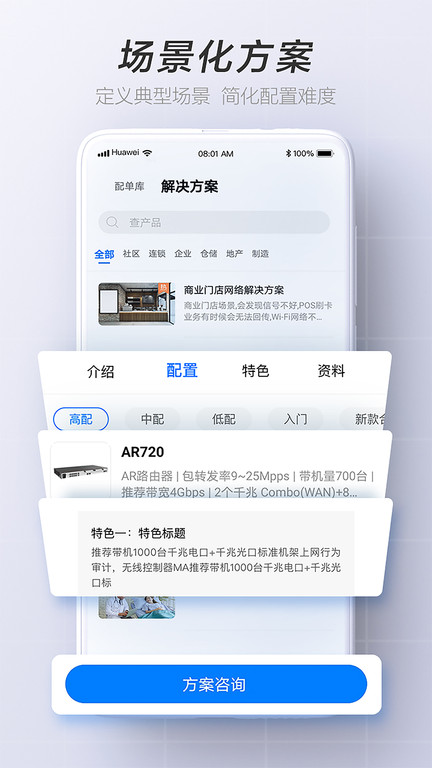 提供分销场景化方案,快速了解方案亮点及销售话术,可基于典型配置一键生成分享方案报价单。