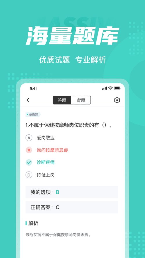 保健按摩师题库内含考点练习,通用卷以及地区卷模拟练习,以及按照固定考试比重的随机式的抽题的真题考场,成绩单实时记录考试数据,一点一滴的反馈考生近期学习状态以及自我正确率的提升,给予考生通过考试的信心.