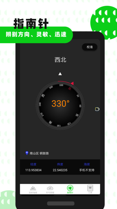 2、一键校准指南针,可以马上使用指南针辨别方向
