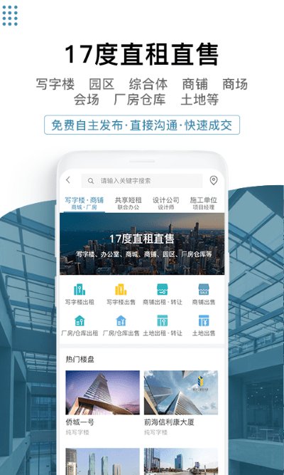 17度建装租售app官方版是一款场地直租方面的使用软件,为你提供了很多的各大商场与产业园里面的租售地方,还能提供应有的装修服务,在保证房源的同时也能利用自己的优势来进行其他的业务,什么问题都能直接线上沟通,使用起来很方便的。