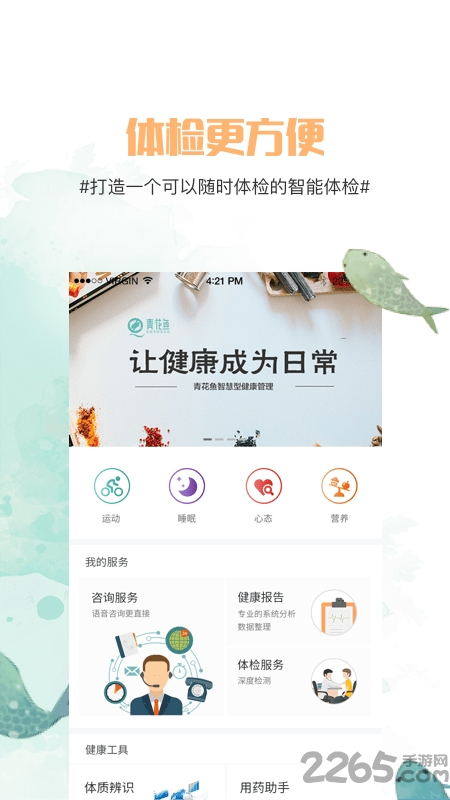 青花鱼app是一款专门致力于健康管理的手机应用软件,我们有专业的团队和医师为你诊断,更有全方位的医疗服务,让你的健康成为日常,更有24小时监控功能。