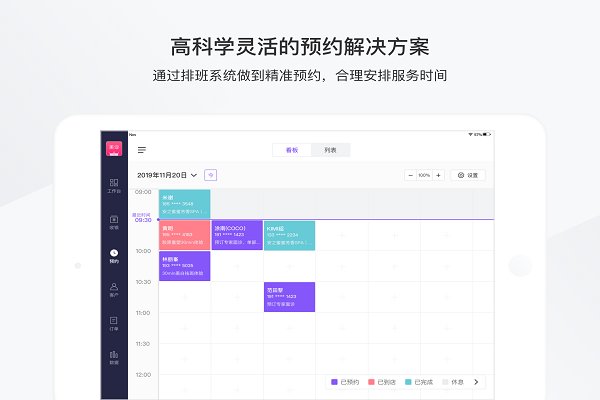3、顾客在线预约服务和到店时间,通过预约中心,你可以管理和新增预约、合理排班