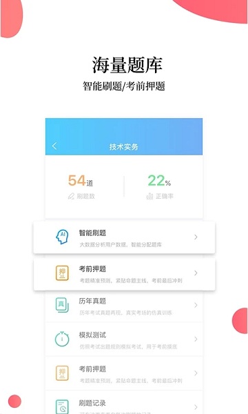 4.提供“随手练一练、章节练习、错题回顾、模拟测试、考前押题、知识库、专家解析”等功能。