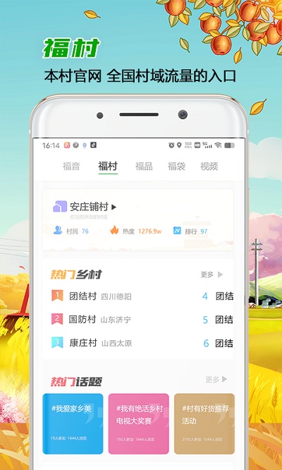 综合性的新闻政务同城生活社区服务软件,特色风景,特色产品,特色事务等等,各种的资讯总能第一时间了解到,还可以帮助广大人民群众享受各种乡村特色风景,更有各种优质健康的农副产品。