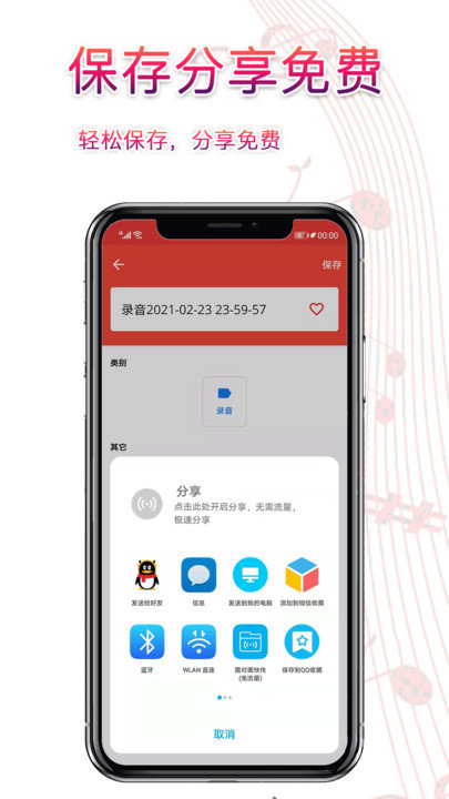 支持在线分享给qq、微信好友,还可通过邮件发送录音,让朋友为您保存电话录音