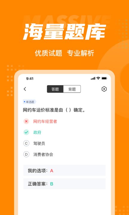 包含了网约车司机考试热点、难点和常考点的考试模拟题库,更有历年真题及模拟试题题型,题库中的试题全真模拟真实的考试,是各位考生学习乃至通过考试的好帮手。全新网约车司机题库,滴滴出行、首汽约车、神州专车、一号专车、美团司机、易到用车、T3出行、曹操专车司机都在用的练题软件,网约车司机考试拿证就用网约车司机考试聚题库APP,是网约车司机从业的考试宝典。