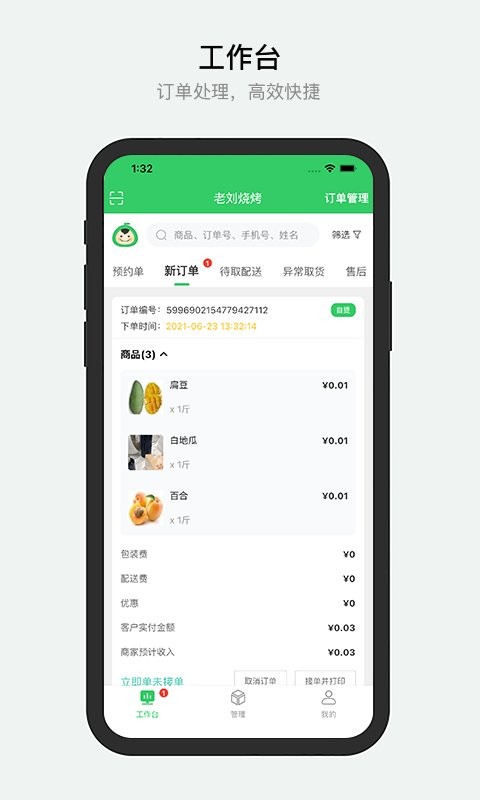 智能提醒接单和抢单服务,让商家用户可以更快速处理订单,实时统计收益数据;