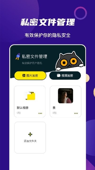 隐私空间app是一个非常方便又实用的手机隐私文件加密管理服务平台。在这里,用户可以直接通过本软件进行手机私密文件加密管理,软件功能全面,操作简单方便,一键添加私密文件至本地空间,不会上传到服务器,保障用户的隐私安全。快来下载试试吧!