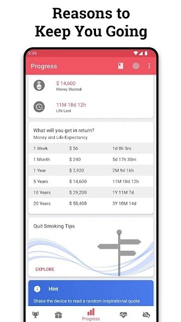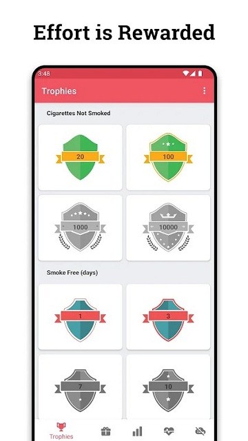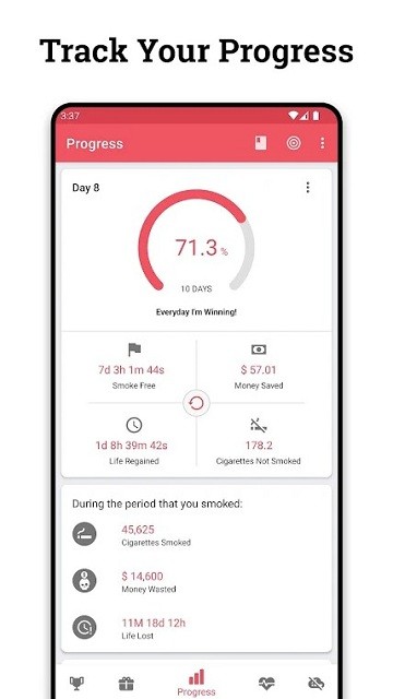 quit tracker手机版是一款跟踪你的戒烟进度、了解通过戒烟可以节省多少钱的工具软件;随时查看戒烟时间表,让你更好地了解自己的戒烟情况,还可以查看如果戒烟,可以获得的奖励,看到戒烟对你身体的积极影响,走过路过的小伙伴们可千万不要错过了,就快来下载使用吧!
