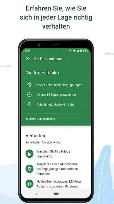 corona warn app德国是一款合理可靠的、由德国专为疫情研究打造的预警软件。使用该软件后,便能更好地追踪新冠病毒的感染链,通过蓝牙与附近的其它手机设备自动连接通过蓝牙与附近的其它手机设备自动连接,App的使用者如果此前接触了现在证实感染的人,那么他将收到警报信息,疫情防控,人人有责,走过路过的小伙伴们还在等什么?快来下载使用吧!