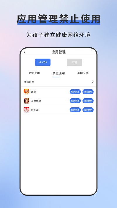【应用管理】:家长可管理孩子手机或平板电脑内的应用使用时间以及使用限制。