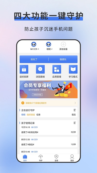 当前孩子在家学习时期,使用熊猫守护可以让家长有效管理孩子手机与平板电脑等电子设备,让2265孩子专注学习。