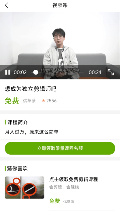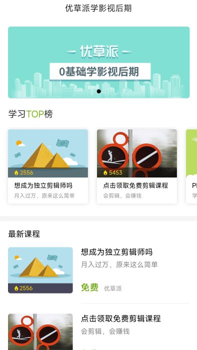 优草派学影视后期app是一个智能学习剪切视频的软件。能够学会多种后期剪辑处理的软件,为想学习影视后期并且通过影视后期的2265用户服务的app。通过app里面的课程学习,并且还有关于影视后期类兼职的视频课程,真正做到从零基础开始,也能最终获得副业收获。