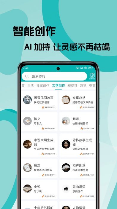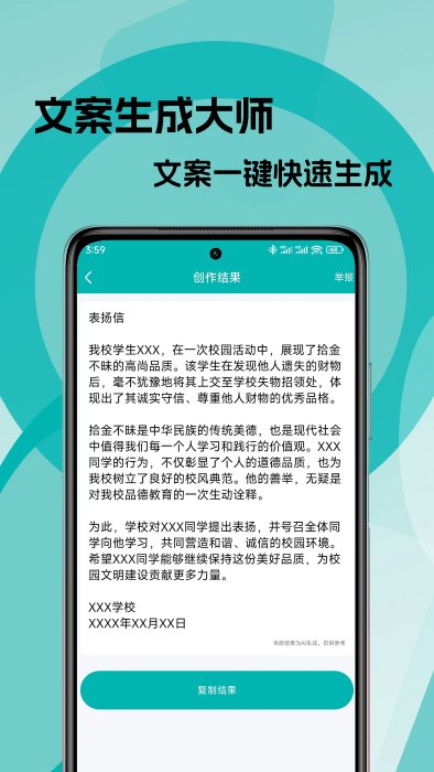 文案生成大师app能让用户们在创作上更加的有选择性,ai技术的加持,拥有不同的智能组合功能,可以在不同的领域里获得解决办法,所有的创作可以获得你想要的答案,还有一些素材直接的使用,满足于不同的使用需求,一起来这里看看吧!