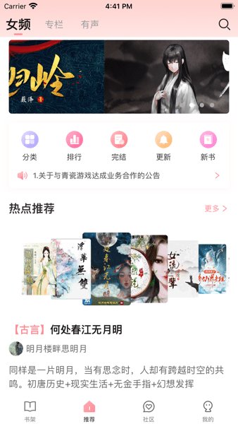 联合阅读女生版,专注于原创女性向网络文学作品的阅读应用,它为用户提供了丰富多样的原创作品,涵盖了各种女性喜欢的题材和风格,还有专属的热点推荐,为您带来更自由的女性网文基地,快来下载试试吧!点击下载就能下载了哦!