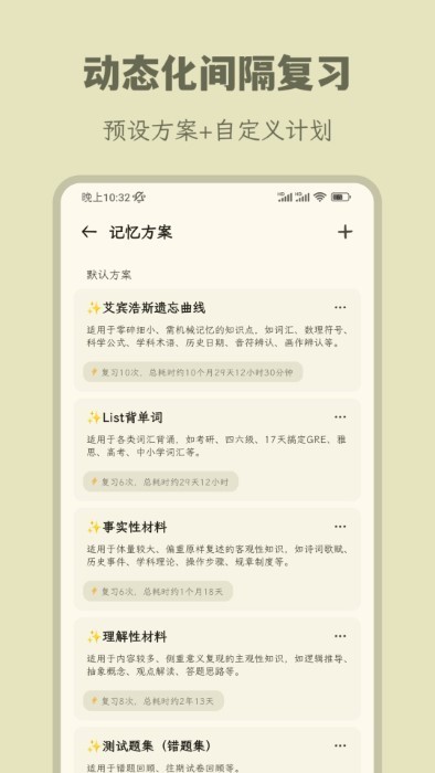 - 科学预设,配置多种针对不同知识属性的复习周期方案、以及间隔重复的具体运作规则供用户选择。