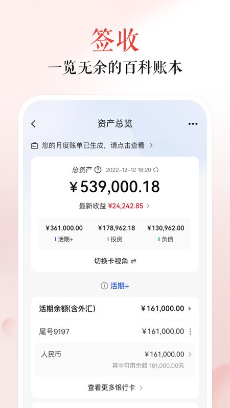 ·资产总览:融合账户与资产负债,可集中查询与管理,让您快速掌握财富全景