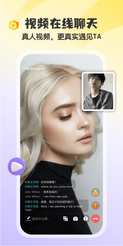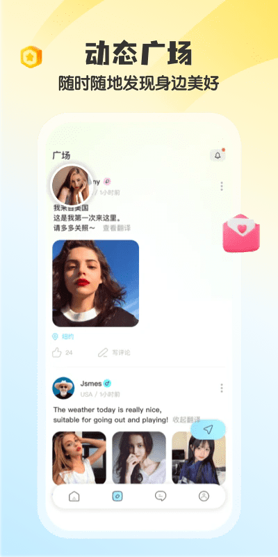实时翻译:为了解决跨国交友的语言障碍问题,我们提供了实时翻译功能,支持100多种语言实时翻译,让您和外国人交友谈恋爱无惧语言