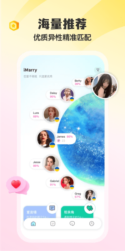 imarry全球婚恋交友app是盐城屯房基科技有限公司旗下的聊天交友软件,可以帮助更多的用户找到国外相亲对象,出国际化的婚恋平台,拥有全球很多地方的单身人士,随时都能聊天,不用担心语言不通,真实的身份,帮你精准匹配,还能视频聊天哦,一起来看看吧!