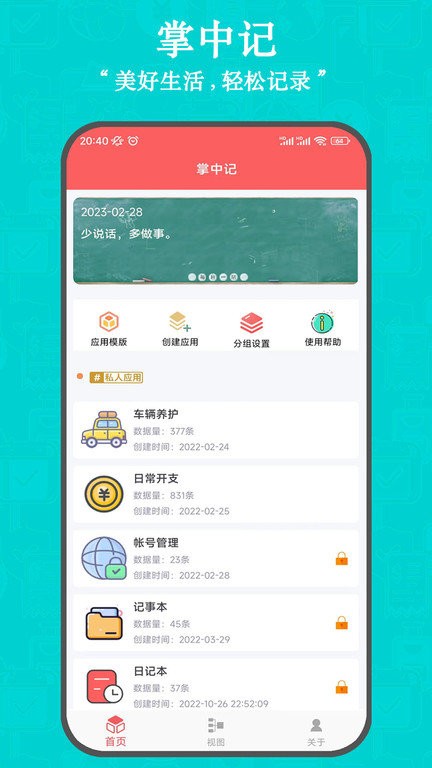 借助掌中记软件,你可以将身边的各种生活数据、工作数据随时随地的进行记录和管理。美好生活,轻松记录。
