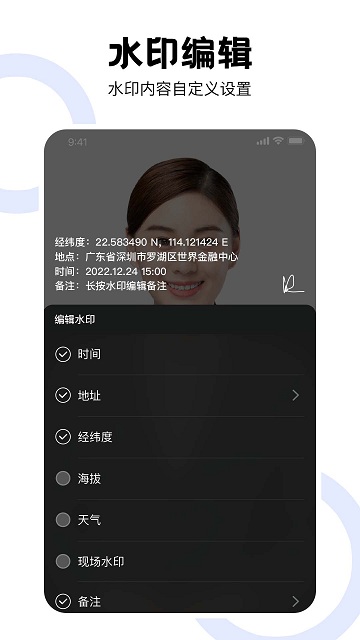 水印可自动更新为实时记录、时间、地点、经纬度、海拔、天气、心情、日记、事项等水印。
