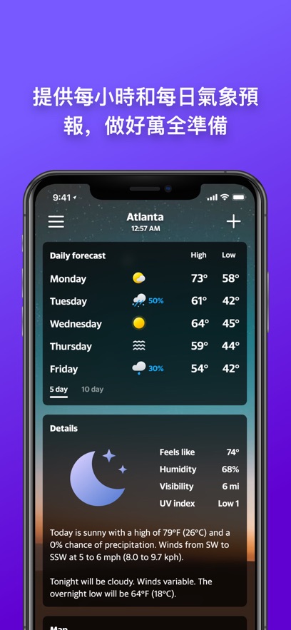 -详尽的天气信息,包括 10 日的天气预报和 24 小时的温度预报